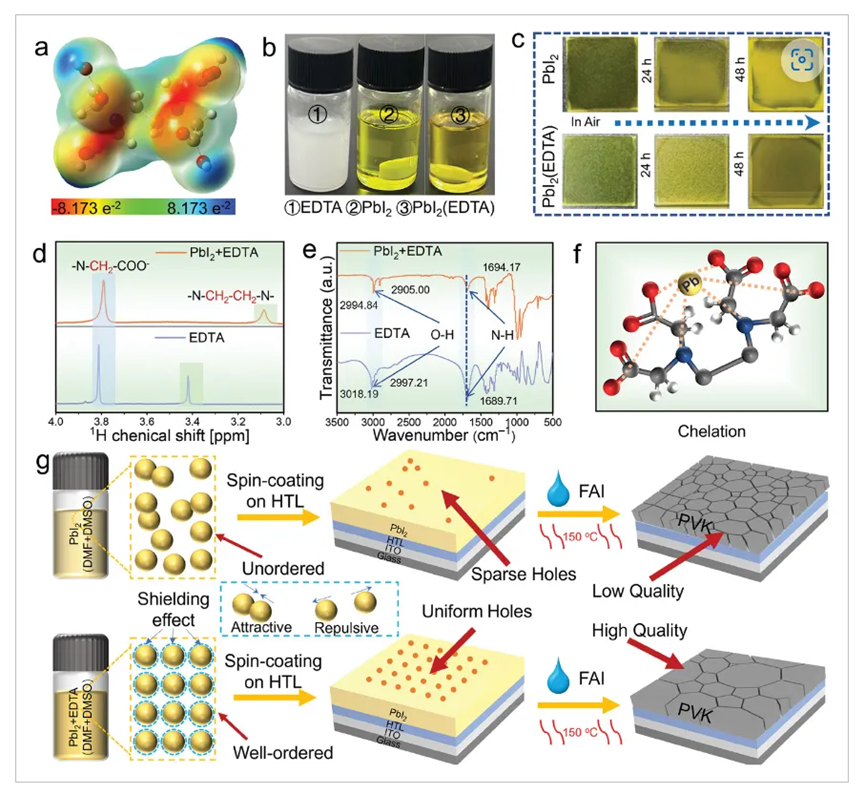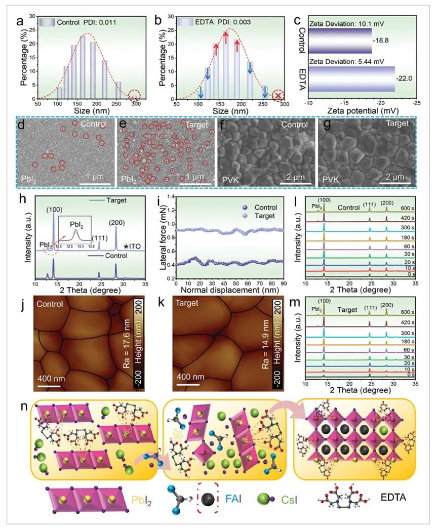 针对这一共性关键科学问题,本工作利用乙二胺四乙酸(EDTA)作为胶体稳定剂引入碘化铅(PbI2)胶体中,通过EDTA与Pb2+螯合,增强了胶体粒子之间的静电排斥和空间位阻。这既稳定了胶体粒子,又抑制了粒子的无序运动(布朗运动)和过度聚集,最终形成了具有均匀空穴分布的PbI2薄膜,为后续的PVK薄膜生长提供了充足的空间。在薄膜形成过程中,碘化甲脒(FAI)和EDTA对分子的取代减缓了结晶速度,最终导致PVK薄膜具有大晶粒尺寸和低缺陷密度。通过这一通用技术,基于FA0.945MA0.025Cs0.03Pb(I0.975Br0.025)3和FA0.97Cs0.03PbI3的有机-无机杂化钙钛矿太阳电池分别实现了25.19%和24.05%的光电转换效率,全无机CsPbBr3钙钛矿电池也获得了11.08%的高效率。