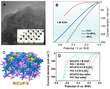 图 1 可用于工业级大电流的NiCoP/S异质结构及其电解(海)水制氢应用研究